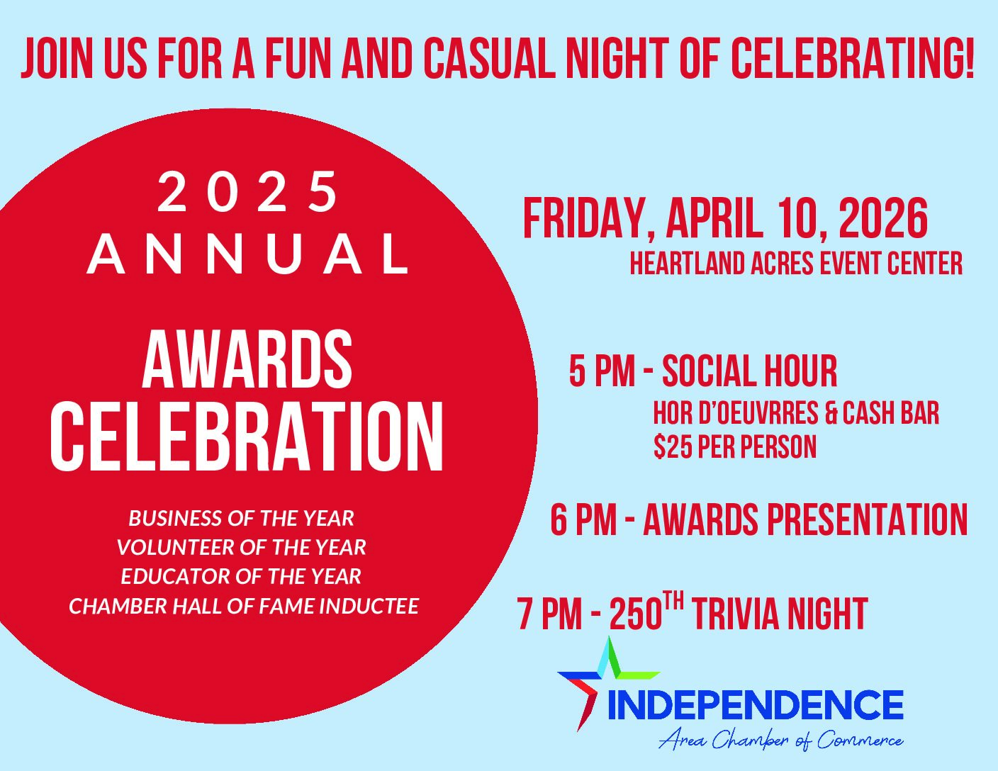 Join Us for the 2025 Annual Chamber Awards Friday – April 10, 2026, when we announce the winners! CELEBRATE with us as we honor the Business of the Year, Volunteer of the Year, Educator of the Year, and the Chamber Hall of Fame inductee! THEN … stay and play 250th trivia!! <— Lots of FUN and PRIZES to be had!